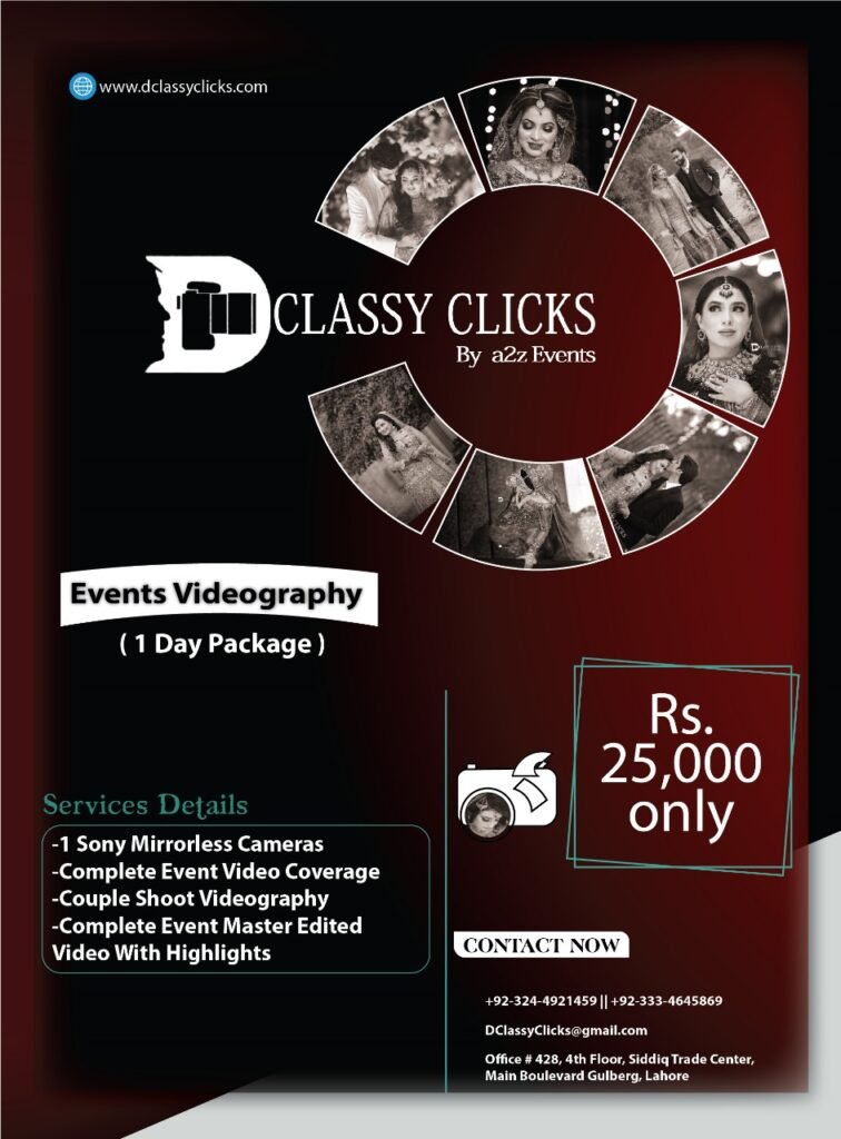Event Videography Rs. 25,000/- (Per Day) SERVICES DETAILS : 1 Videographer with DSLR / Sony Mirrorless Camera for Event Videography Complete Event Coverage Couple Shoot Videography Complete Event Edited Video with Highlight