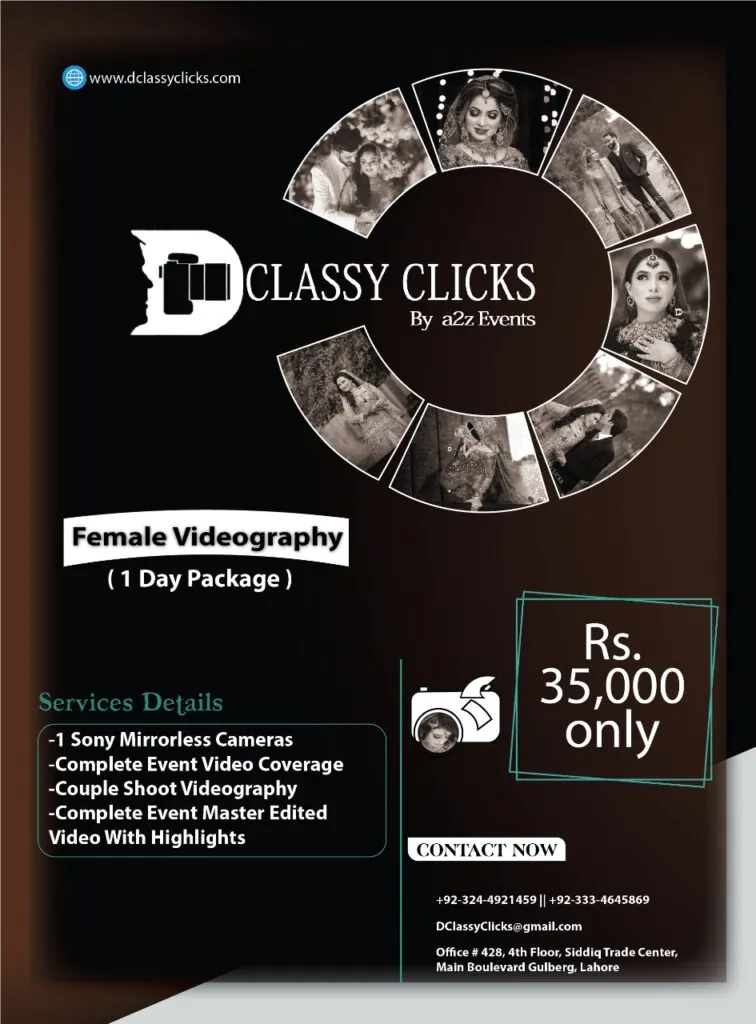 Female Videoraphy Rs. 35,000/- (Per Day) SERVICES DETAILS : 1 Professional Female Videographer with DSLR / Sony Mirrorless Camera Complete Event Video Coverage Couple Shoot Videography Complete Event Master Edited Video with Highlight